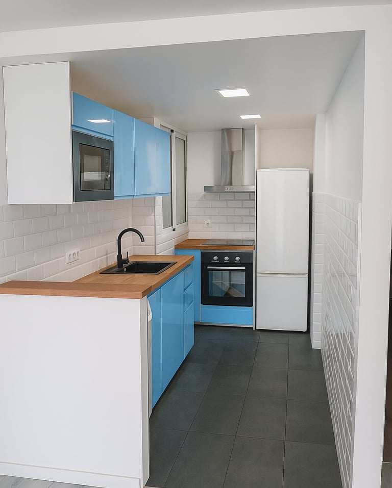 Se instalaron muebles nuevos de cocina con acabado blanco brillante, encimera de madera natural, fregadero y grifería modernos, junto con horno, campana extractora y nevera integrados, logrando un ambiente limpio y actual.